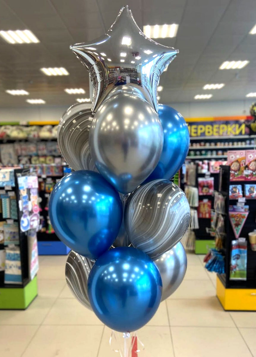 Букет из шаров хром-агат Звезда синий-серебро 10 шт