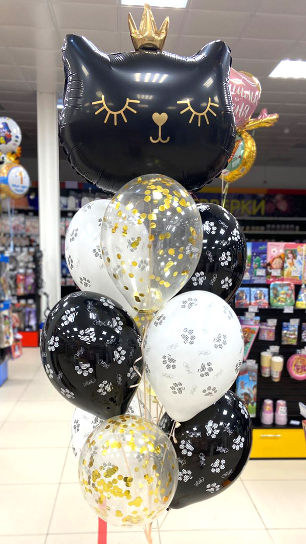 Шар фольга Фигура Голова Кошки в короне черная 1 штШар латксный Кристалл прозрачный с декоративным наполнением конфетти круги золото 30 см 3 шт